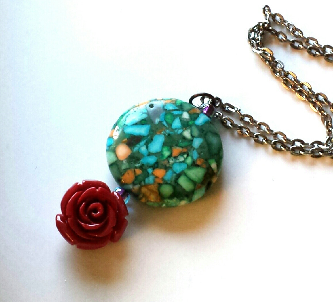 Turquoise Green Conglomerate Red Rose Pendant Necklace