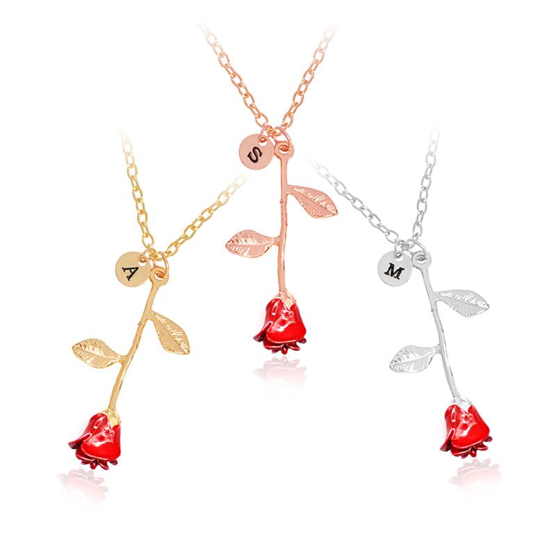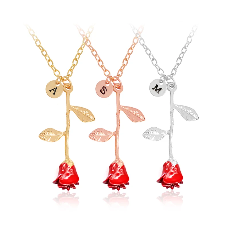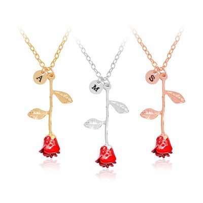 Us 1 56 21 Off 26 Letter Red Rose Pendant Necklace Flower Zinc Alloy Jewelry Woman Fashion Accessories Valentine S Day Family Romance Gift In