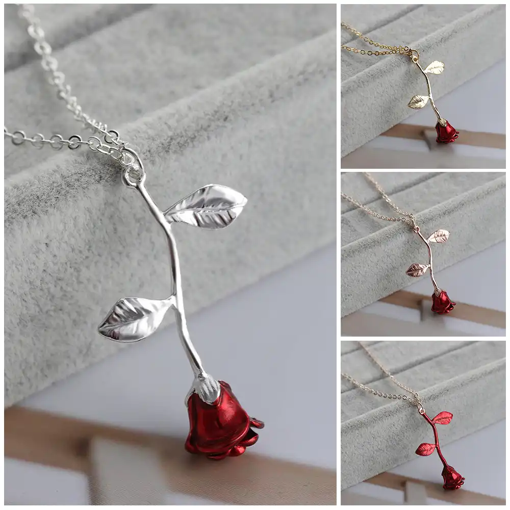 Details About Plated Women Handmade Jewelry Necklace Red Rose Flower Pendant Valentine Gifts