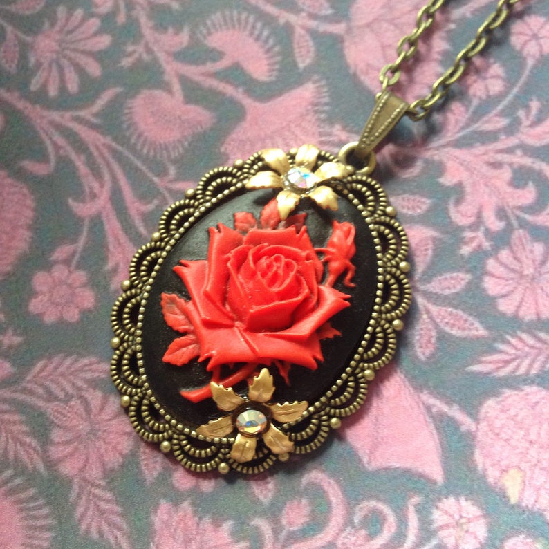 Rose Pendant Necklace Victorian Style Necklace Rose Cameo Black Jewelry Red Necklace Red Rose Jewelry Rose Pendant Necklace