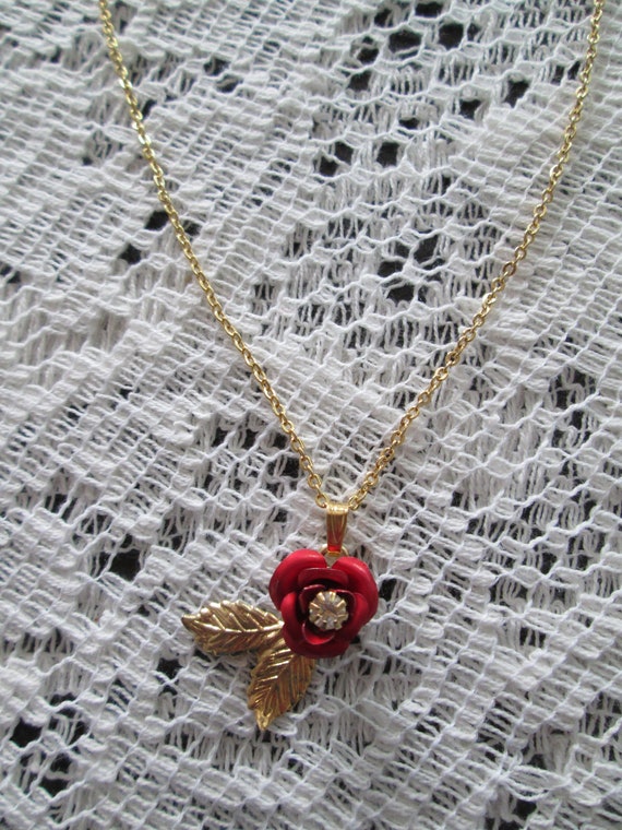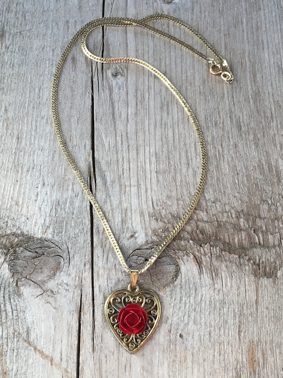 Vintage Red Rose Pendant Necklace Gold Heart Necklace Red Rose Necklace Rose Heart Gold Necklace