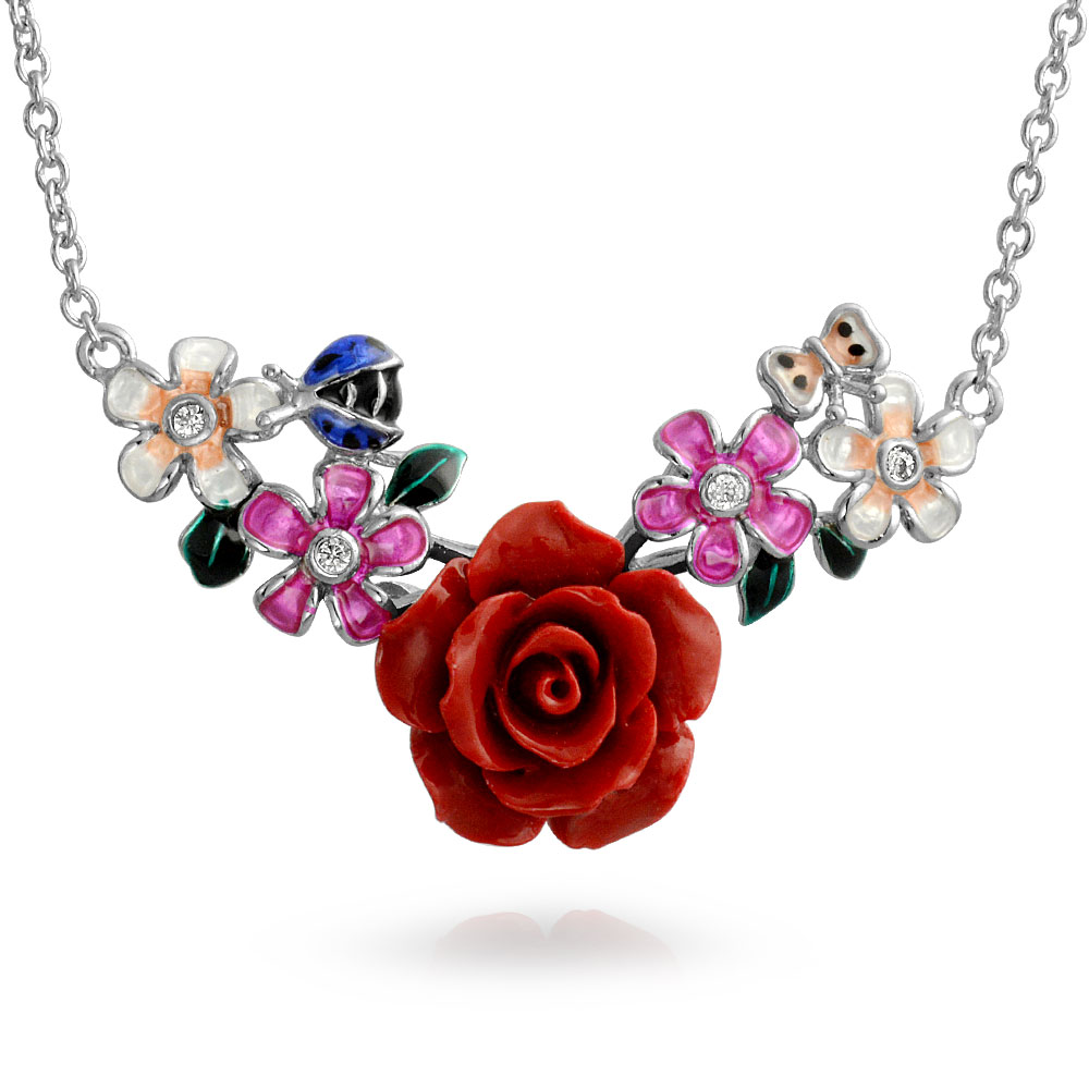Carved Red Rose Colorful Flower Bouquet Station Pendant For Women Necklace For Mother 925 Sterling Silver
