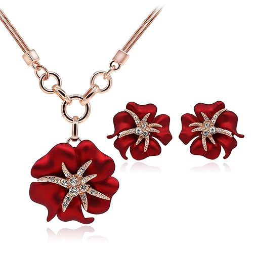 C17311 Trendy Design Set Red Rose Pendant Necklace Rhinestone Earrings Set