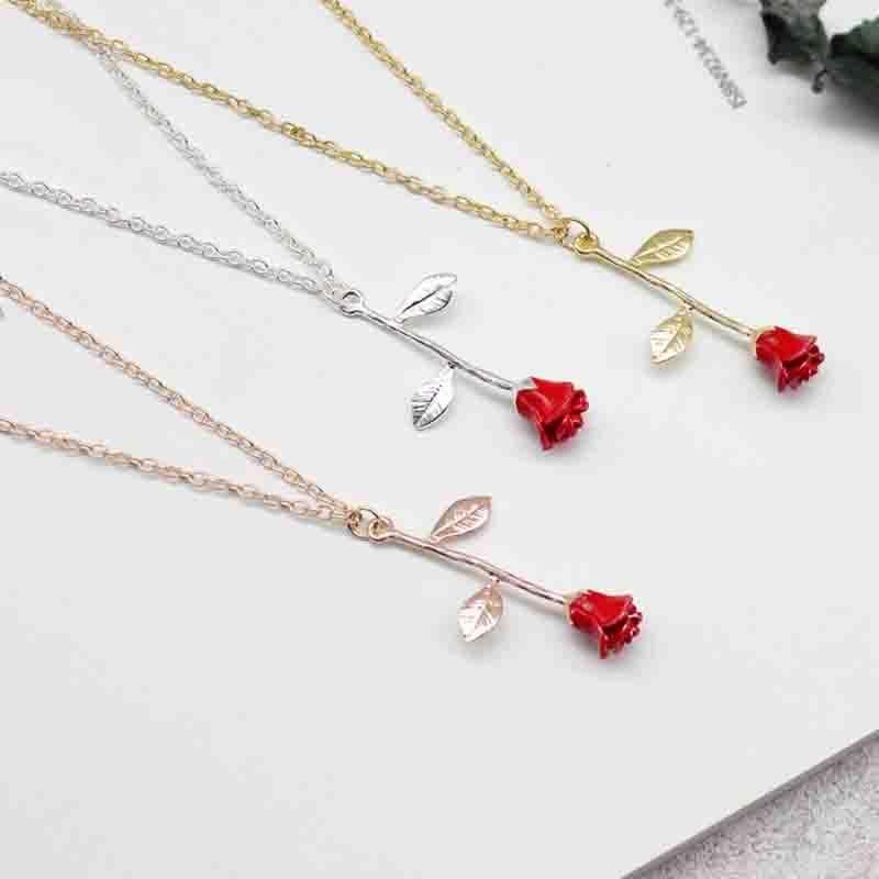 Delicate Handmade Alloy Red Rose Flower Pendant Necklace Beauty Gold Silver Plated Charm Valentine Gifts Women Fashion Jewelry