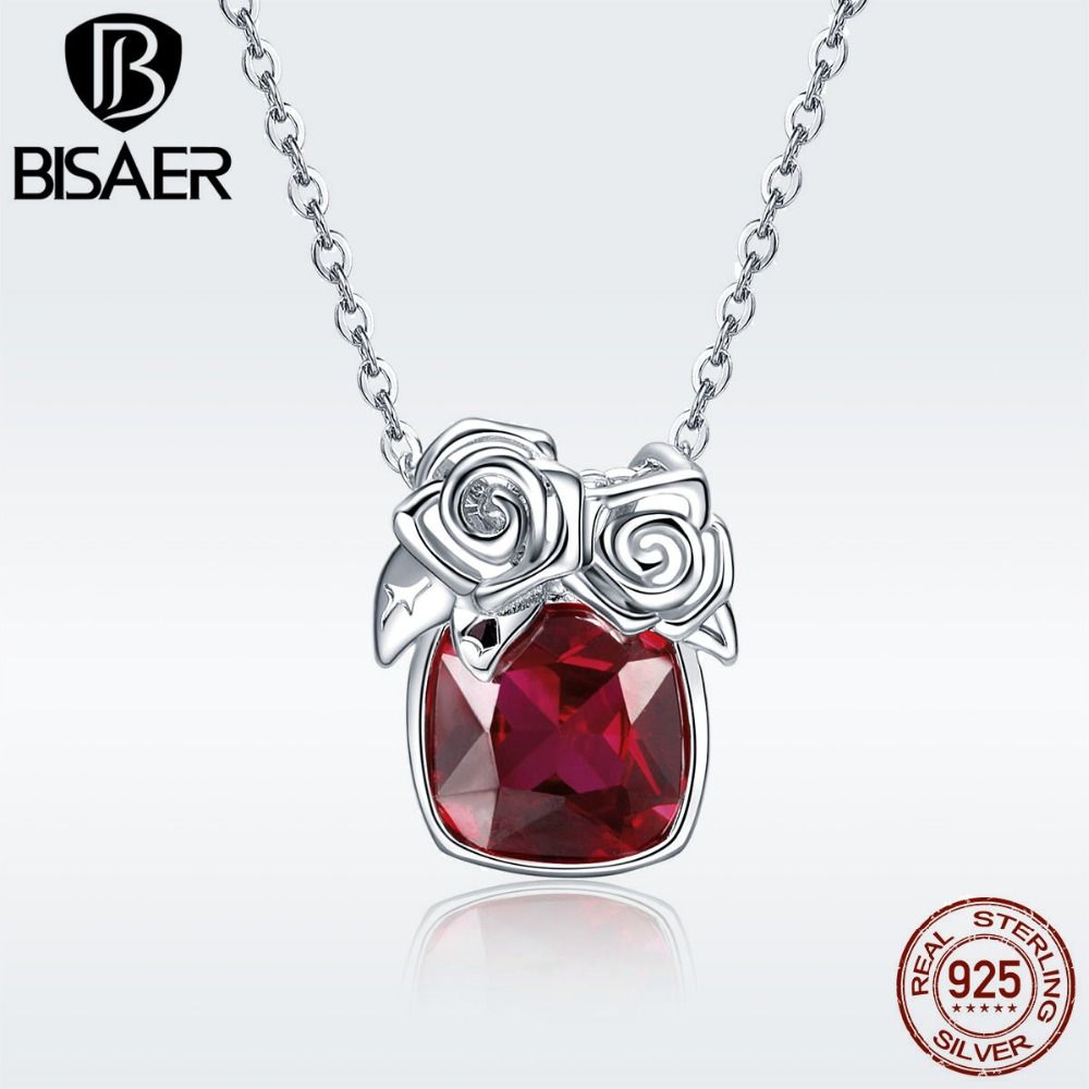 Bisaer 925 Sterling Silver Red Rose Flower Pendant Necklace Square Cz Necklaces For Women Sterling Silver Jewelry Collar Efn003