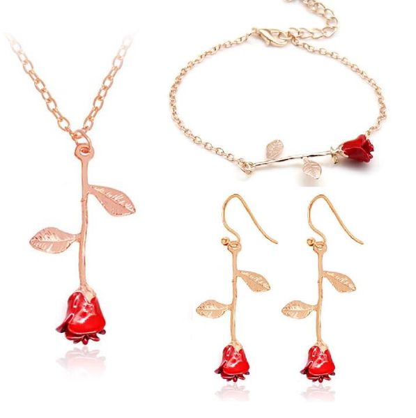2019 New Red Rose Pendant Necklace Bracelet Earrings Jewelry Sets Imitation Rose Jewelry Women Fashion Accessories Lovers Valentine S Day Gifts From